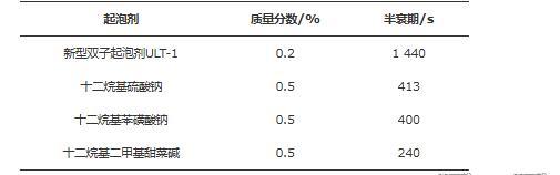 起泡性能主要是指起泡能力和泡沫穩定性。發泡體積V0反映了起泡能力,析液半衰期t1/2反映了泡沫穩定性。在室溫下,稱取一定質量的起泡劑ULT-1于攪拌杯中,加入100 mL蒸餾水,置于攪拌器之上,以轉速11 000 r/min攪拌1 min。攪拌完畢后,立即取下攪拌杯,同時啟動秒表,開始記錄消泡時間,將攪拌杯中的所有物質全部倒入1 000 mL量筒中,讀取發泡體積和從泡沫中析出50 mL液體的時間,即為半衰期。通過改變起泡劑ULT-1的質量測量起泡性能與起泡劑質量分數的關系,結果如圖7所示。從圖7可知:隨起泡劑ULT-1質量分數的提高,發泡體積增加幅度較大,半衰期緩慢增加。當ULT-1質量分數升到0.2%時,發泡體積達到501 mL,半衰期達到1 440 s,繼續提高質量分數發泡體積和半衰期基本不變,表明研制的新型起泡劑ULT-1低濃度時即具有較高的起泡性能,發泡體積高,泡沫半衰期長。同時,對比評價了常用起泡劑的半衰期,結果如表1所示。從表1可知:質量分數為0.2%的起泡劑ULT-1與質量分數為0.5%的常規起泡劑相比,泡沫半衰期可提高3倍以上。