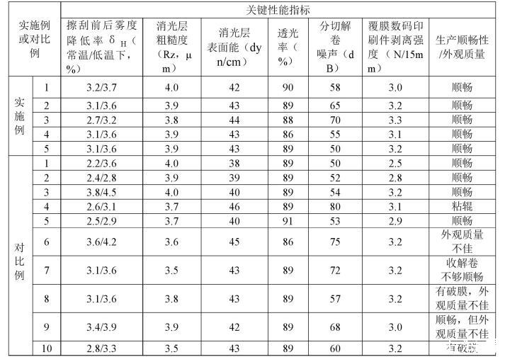從實(shí)施例1~實(shí)施例5的數(shù)據(jù)可知,本發(fā)明的耐擦刮無(wú)膠消光膜在常溫和低溫環(huán)境下均具有良好的耐擦刮性能,實(shí)現(xiàn)了消光層表面在耐擦刮性、高表面張力(與印刷適性正相關(guān))與收解卷順暢性的平衡。其中實(shí)施例4中球體抗粘連劑為球體聚硅氧烷,雖然制得的薄膜的透光率相比實(shí)施例2有所下降,但是薄膜的分切解卷噪聲降低明顯,總體性能是符合本申請(qǐng)要達(dá)到的目標(biāo)的。實(shí)施例5中,在熱復(fù)合層中加入了適宜熔融指數(shù)的高密度聚乙烯,其制備的耐擦刮無(wú)膠消光膜表現(xiàn)出更低的分切解卷噪聲,解卷順暢性更好,且未對(duì)薄膜的透光率和熱復(fù)合層與印刷件之間的剝離強(qiáng)度產(chǎn)生不良影響。