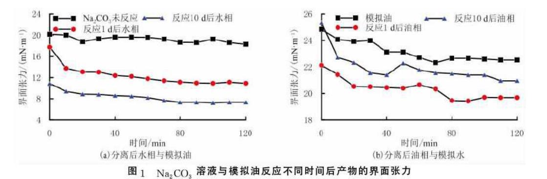 由圖1(b)可以看出,Na2CO3溶液與模擬油反應1d和10d后分離出的油相與模擬水間界面張力低于模擬油與模擬水間的界面張力。這是由于Na2CO3溶液與模擬油反應生成油溶性的界面活性物質且留在油相中,隨著反應時間的增加,反應生成的界面活性物質增多,使界面張力較模擬油與模擬水的界面張力降低。這說明模擬油中存在相對分子質量較大且反應活性低的界面活性物質,長時間與Na2CO3溶液反應后生成油溶性較強的界面活性物質且溶于油相中,使油水界面張力下降較多。