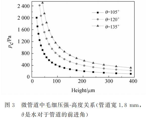 其中,l_i是液體與管道第i條邊接觸線的長度,theta_i是液體對于管道第i條邊的前進角,對于矩形管道有i=1,2,3,4。毛細壓強和管道高度的關(guān)系如圖3所示。液體在疏水網(wǎng)表面的流動阻力計算比較復雜,現(xiàn)在有很多的研究文獻,由于這不是本文的研究重點,文中采用了簡化分析,即把柵網(wǎng)作為一個光滑的表面。計算中認為柵網(wǎng)與管道的表面特性相同。