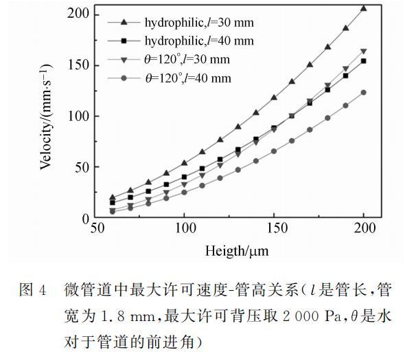 利用約束條件式(5)或(6),可以得到管道中液體的最大許可速度。為了簡化分析,假設(shè)出口處壓強為0。計算中假設(shè)管道各個壁面性質(zhì)相同。利用式(4)計算壓降時要求流動定常,當液體流過干燥管道時并不是定常流動,利用式(4)作近似計算。最大許可速度與管道高度的關(guān)系如圖4所示,包括疏水管道和親水管道兩種情況。可以看出,管高一定時,在親水管道中最大許可速度較大,且最大許可速度隨管高增加而增大,隨管長的增加而減小。