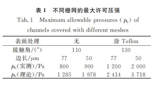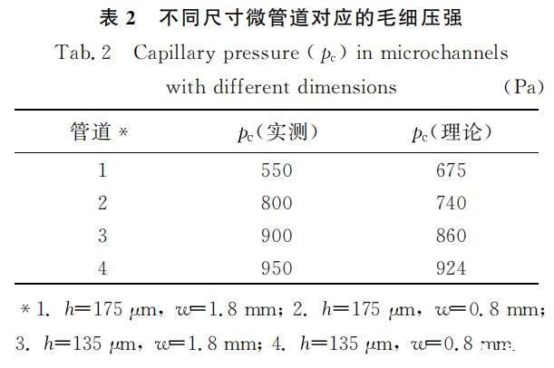 當水流過干燥管道時,表面張力產(chǎn)生的毛細壓強阻礙水的流動,此時的速度-壓強關(guān)系如圖8所示。在圖8的每條曲線上都有一個轉(zhuǎn)折點,且在轉(zhuǎn)折點之后水的流速迅速增加,轉(zhuǎn)折處的壓強被作為毛細壓強p。對于這種現(xiàn)象可解釋為在壓強小于毛細壓強的時候,水只能在重力作用下極緩慢流動,由于速度極慢,沿程水頭損失可忽略不計;當壓強大于毛細壓強時,黏性力和壓強差平衡,這時的流速增加較快。毛細壓強Pc的實測值和理論值如表2所示。水對于PDMS和壓敏膠的前進角都是120°,對于Teflon涂膜的柵網(wǎng)接觸角是150°(芬蘭Kibron公司生產(chǎn)的Delta-8全自動高通量表面張力儀)。實驗結(jié)果與理論計算一致。