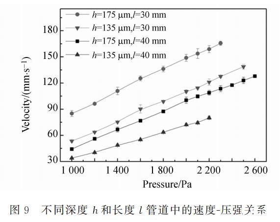 管道中充滿水時的速度-壓強關(guān)系如圖9所示。管道截面尺寸主要通過等效水力直徑影響摩擦阻力系數(shù)。由于管道深度遠小于寬度,管道的等效水力直徑取決于管道深度,故這里固定管道寬度而對不同深度的管道進行比較分析。由圖9可知,壓強一定,管道越深,長度越短,對應的流速越大。圖中每條曲線的最大壓強就是測量中每個管道的最大許可壓強,這些壓強值都大于表1中的最大許可壓強實測值。這一方面是由于柵網(wǎng)孔徑分布不均勻,另一方面是由于沿程水頭損失作用,管道中壓強分布沿流動方向減小,導致最大壓強沒有出現(xiàn)在孔徑最大的地方,從而得到的壓強大于靜止狀態(tài)下測得的最大許可壓強。