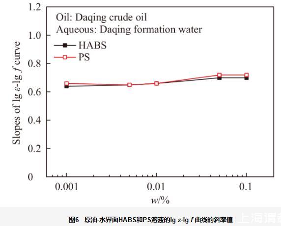 圖6為PS和HABS在原油-水界面的lgε-lg f曲線的斜率。在原油-水界面,HABS的斜率與PS的斜率幾乎相同,都約為0.7。這與圖4中正癸烷-水界面的兩種表面活性劑的曲線斜率明顯不同。PS在原油-水界面的斜率值比在正癸烷-水界面的斜率值高,而HABS在原油-水界面的斜率值比在正癸烷-水界面的斜率值低。這是由于大慶原油的活性組分在界面上混合吸附,對界面膜的黏彈特性也有貢獻。大慶原油屬于輕質原油,原油組分中小分子量的石油酸組分較多,尺寸較大的瀝青質較少。小分子量原油活性組分在界面上的吸附,一方面降低了分子尺寸較小的HABS體系的黏性,一方面增大了分子尺寸較大的PS體系的黏性。因此,在原油-水界面,HABS和PS體系lgε-lg f曲線的斜率相差不大。