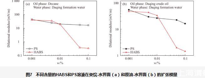 圖7不同含量的HABS和PS溶液在癸烷-水界面(a)和原油-水界面(b)的擴張模量