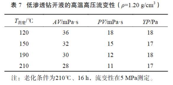 表7低滲透鉆開(kāi)液的高溫高壓流變性(ρ=1.20 g/cm3)