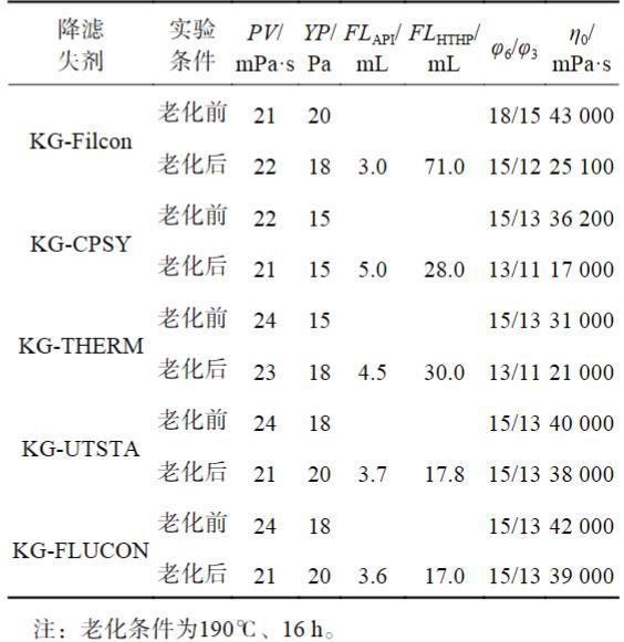 為避免超高溫下材料間的相互影響干擾判斷,室內(nèi)在190℃下先固定KG-TNJ作為增黏劑材料不變,對(duì)5種改性淀粉類(lèi)高溫降濾失劑材料進(jìn)行了初選。其中,KG-Filcon為海上常用抗高溫改性淀粉;KG-CPSY和KG-THERM均為聚合物接枝改性抗高溫淀粉;KG-UTSTA和KG-FLUCON均為室內(nèi)使用2-丙烯酰胺基-2-甲基丙磺酸AMPS、聚苯乙烯乳液與可溶性淀粉在堿性條件下通過(guò)接枝共聚生成抗超高溫改性淀粉,2者區(qū)別在于KG-UTSTA為機(jī)械攪拌條件下共聚合成,KG-FLUCON為超聲波機(jī)械協(xié)同方式混勻后再進(jìn)行合成。評(píng)價(jià)配方:基礎(chǔ)配方+1.0%KG-TNJ+2.5%降濾失劑,實(shí)驗(yàn)結(jié)果見(jiàn)表2。由表2可知,190℃老化后,各體系的流變性能穩(wěn)定,KG-UTSTA和KG-FLUCON體系的高溫高壓降濾失性最好,濾失量小于20 mL,KG-CPSY和KG-THERM體系的高溫高壓降濾失性能次之。分析原因?yàn)楦男缘矸鄱家肓丝垢邷亟又簿蹎误w,但是KG-FLUCON、KG-UTSTA除了引入AMPS類(lèi)抗高溫單體外,還引入聚苯乙烯乳液,增加了接枝改性的抗高溫基團(tuán)和空間結(jié)構(gòu),通過(guò)聚苯乙烯乳液組分的吸附、滲透、覆蓋包裹特性增強(qiáng)了對(duì)淀粉結(jié)構(gòu)的高溫保護(hù)作用和產(chǎn)物的成膜封堵性能,改善了其抗高溫性和濾失造壁。