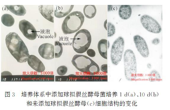 圖3培養體系中添加球擬假絲酵母菌培養1d(a)、10d(b)和未添加球擬假絲酵母(c)細胞結構的變化