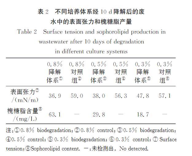 表2不同培養體系經10d降解后的廢水中的表面張力和槐糖脂產量