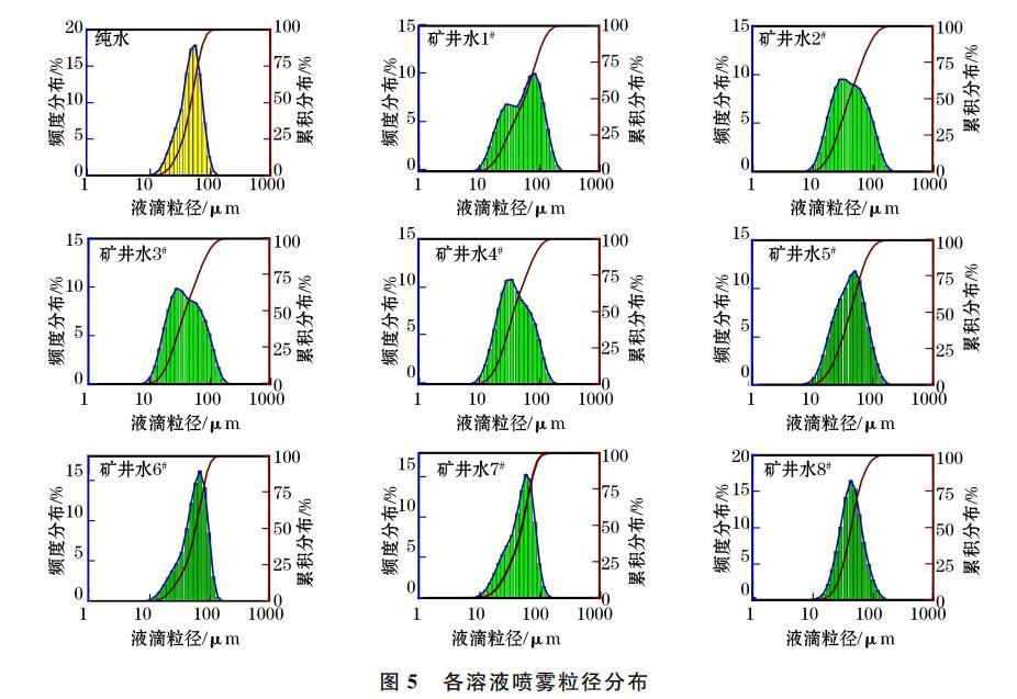 噴霧降塵效果與霧化特性參數密切相關,其中霧滴粒徑是影響霧化特性的關鍵因素。9組溶液在15cm測點處的粒徑分布如圖5所示。由圖5可知,各溶液霧滴粒徑主要分布為25~75μm,純水、礦井水1#至4#和礦井水5#至8#噴霧粒徑位于該區間的平均比例分別為80.10%、55.87%、69.73%,礦井水1至8#的粒徑累積分布曲線斜率逐漸增加,這說明礦井水霧化效果不斷提升。由此可知,礦井水中Na+、K+離子濃度越低,霧滴粒徑分布越集中,其霧場更有利于呼吸性粉塵捕集。這是由于礦井水表面張力減小,霧滴破碎程度逐漸提高,致使霧滴細化且粒徑集中分布于25~75μm區間,這說明噴霧霧化特性隨表面張力減小不斷優化,霧滴粒徑趨向均勻分布。綜上,礦井水中Na+、K+離子濃度差異改變其表面張力,從而影響噴霧粒徑分布、霧化百分比等特性。