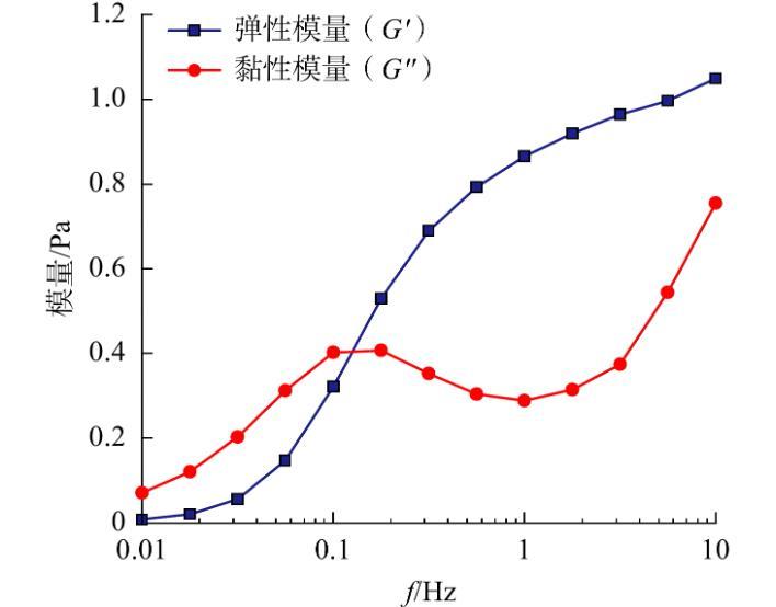 圖8為小段塞的黏彈性隨振動頻率(f)的變化情況。從圖8可看出,在低頻段,符合Maxwell流體模型。G"遠大于G',體系黏性占主導。隨著f的增大,G'迅速增長,增長到一定頻率時,G'變化曲線增長減緩。此時,G"隨著頻率的增大先增加后減小。當f繼續增大,體系處于高頻段,G''有所增加??梢?,體系中存在膠束的破壞與重組,此時體系主要表現為彈性性能。在低頻區,形變發生較慢,膠束鏈能量較低;在高頻區,膠束鏈間沒有充足時間來發生滑動,膠束鏈交聯纏結點與固定網格節點近似相同,高的頻率使得這些網格結構的彈性逐漸增強。