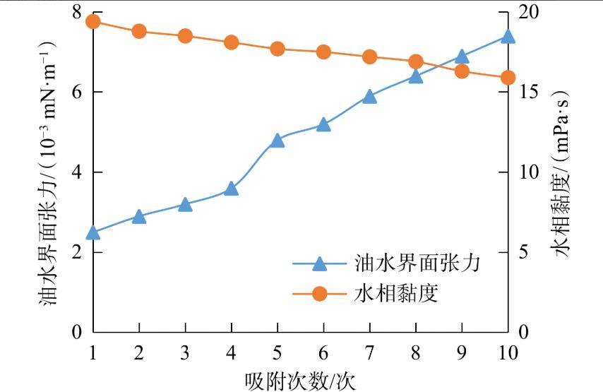圖6為使用巖心粉對質量分數為2.7%的ACS-2溶液重復進行10次吸附實驗后的油水界面張力和水相黏度。從圖6可看出,隨著吸附次數的增加,ACS-2高黏表面活性劑體系的油水界面張力呈增大趨勢,黏度值緩慢下降。ACS-2在巖心上的吸附適中,多次吸附后在油水界面上的表面活性劑仍足以使界面張力處于超低值,能達到行業內有效驅油對表面活性劑的要求。