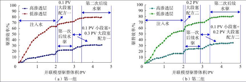 從表1可知,通過并聯天然巖心表面活性劑驅油實驗發現,只用大段塞驅平均提高采收率7.4個百分點,非常低。而采用組合段塞進行調和驅,第一組組合段塞驅在高低滲層分別提高驅油效率10.1個百分點和17.7個百分點。第二組組合段塞驅在高低滲層分別提高原油采收率10.2個百分點和16.1個百分點,兩組組合段塞驅平均提高采收率為14.8個百分點,比只用大段塞驅平均采收率提高了1倍,達到了聚/表二驅的驅油效果。