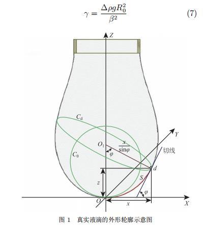 在 Young-Laplace 理論方程的基礎上,Bashforth 和 Adams 通過進一步推導得到了懸滴法和躺滴法的表面張力測量工作方程,懸滴法的測量工作方程主要基于兩個基本假設:1) 懸垂液滴在重力和表面張力的共同作用下處于平衡狀態;2) 懸垂液滴的形狀呈現完美的中心軸對稱。對處于平衡狀態的真實懸垂液滴,通過圖像處理軟件精準提取液滴的外形輪廓,以液滴頂點為坐標原點建立空間直角坐標系,如圖 1 所示,則液滴輪廓 d 點應滿足的關系式為: