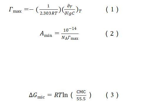 根據(jù)表面張力和濃度的關(guān)系曲線,使用吉布斯吸附等溫線〔方程(1)〕計(jì)算出表面活性劑分子吸附在氣液界面的最大表面過剩濃度(Гmax)。