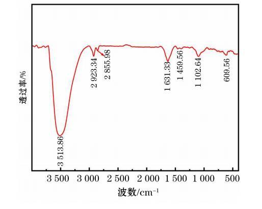 圖4顯示了YTDB的紅外光譜測試結(jié)果。由圖4可知,3513.86 cm?1處出現(xiàn)了一處弱寬峰,是N—H伸縮振動峰;2923.34 cm?1出現(xiàn)的弱峰以及2855.98 cm?1處出現(xiàn)的弱峰分別是—CH?—對稱伸縮振動峰以及非對稱伸縮振動峰;1631.33 cm?1處和1459.56 cm?1處出現(xiàn)的兩個峰,均為—NH?彎曲振動吸收峰;1102.64 cm?1處出現(xiàn)了一個弱寬峰,是C—N伸縮振動吸收峰。