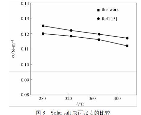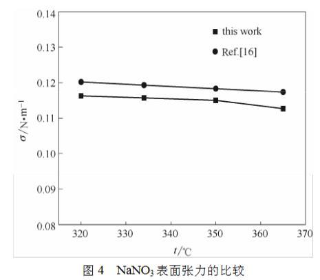 在此基礎(chǔ)上,對單組分NaNO3和混合熔鹽Solar salt(60%NaNO3+40%KNO3,質(zhì)量分數(shù))的表面張力進行驗證。Solar salt和NaNO3的表面張力測量結(jié)果分別與文獻中的值比較,結(jié)果如圖3和圖4所示。