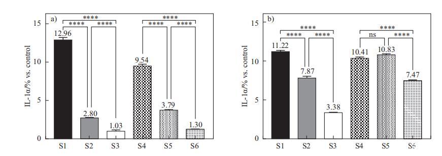 IL-1a值是從用稀釋的表面活性劑復(fù)合物S1-S6(濃度為0.015%和0.020%)處理24小時(shí)后收集的上清液進(jìn)行分析的。選擇的處理濃度是細(xì)胞仍然存活,同時(shí)可以觀察到IL-1a釋放差異的濃度(數(shù)據(jù)未顯示)。IL-1a值與未經(jīng)任何處理的對照樣品校準(zhǔn)后進(jìn)行比較。如圖4所示,在表面活性劑復(fù)合物中加入海藻糖脂(S3和S6)可顯著減少二元體系S1和S4的細(xì)胞因子釋放。但在SMCT/CAPB體系中加入DG(S4 vs S5)在0.02%時(shí)并未抑制IL-1a釋放。此外,海藻糖脂比DG更能降低IL-1a釋放,且差異顯著(S3 vs S2,S6 vs S5)。在濃度效應(yīng)方面,它對三元體系(S2-S3,S5-S6)影響更大,意味著非離子表面活性劑可以在較低濃度下進(jìn)一步抵消離子表面活性劑對IL-1a的刺激。
