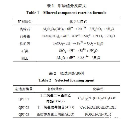 圖1為2口低產井采集樣品的X射線衍射結果。可以看出,2種無機礦物樣品中硅酸鹽巖成分占比大,因此選用乙酸、鹽酸、氫氟酸3種常規酸液進行無機礦物溶蝕試驗,理想狀態下礦物組分被單一酸液的侵蝕過程見表1。選用的3種常見起泡劑分別為:十二烷基二甲基胺乙內酯(BS-12)、十二烷基葡萄糖苷(APG)、脂肪醇聚氧乙烯醚(AEO),見表2。其中BS-12為兩性離子型起泡劑、APG為陰?非離子型起泡劑、AEO為非離子型起泡劑。