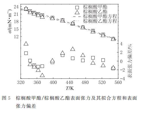 圖5 棕櫚酸甲酯、棕櫚酸乙酯的表面張力及其與方程(8)計(jì)算值的偏差