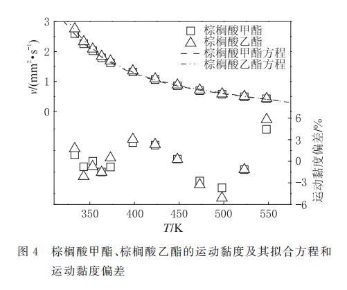 表8 棕櫚酸甲酯、棕櫚酸乙酯運(yùn)動(dòng)黏度方程(6)的擬合系數(shù)