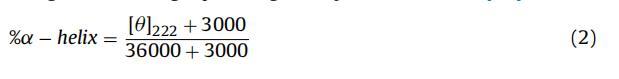 其中 θλ 是在波長處觀察到的橢圓度(以毫度為單位) λ,M0 是蛋白質(zhì)的平均殘基重量,c 是蛋白質(zhì) 以克/立方厘米為單位的濃度,l 是細胞的光程長度,以厘米為單位。 222 nm 處的橢圓度值 (θ222nm/mdeg)用于計算BSA的α-螺旋含量 使用 Morrisett 等人給出的以下等式。 [44]