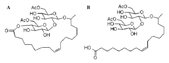 圖1(a)10400內(nèi)酯和(b)游離酸形式的17-L-[20-O-b-吡喃葡萄糖基-b-D-吡喃葡萄糖基)-氧]-9-十八烯酸60600二乙酸酯槐脂的結(jié)構(gòu)