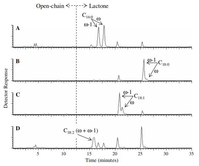 TIC(圖2)中對應于含有棕櫚酸、硬脂酸和油酸的SLs的峰均顯示具有相同質(zhì)譜的第二個峰。 根據(jù)之前報告的數(shù)據(jù)(Nun?ez et al.2001),我們得出結(jié)論,在這兩個峰中,首先洗脫的峰對應于結(jié)構(gòu)變化,槐糖環(huán)的10-羥基和脂肪酸的x-1碳之間存在糖苷鍵,而隨后的洗脫峰(通常是除SL-p外的一個次要峰) 通過糖環(huán)與脂肪酸的x碳之間的糖苷鍵連接。 根據(jù)APCI-MS結(jié)果,確定在每種情況下,無論底物如何,超過92%的SL分子為內(nèi)酯構(gòu)象(表1)。