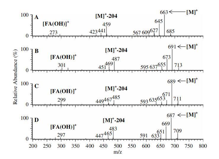 圖3正大氣壓化學電離(APCI)-來自圖2中每個TIC色譜圖基峰的質(zhì)譜圖。 圖2的TIC中的C16:0二乙?;敝瑑?nèi)酯(RT=16.7分鐘)、圖2的TIC中的C18:0二乙酰化槐脂內(nèi)酯(RT=25.2分鐘)、圖2c的TIC中的C18:1二乙?;敝瑑?nèi)酯(RT=20.7分鐘)和圖2d的TIC中的C18:2二乙?;敝瑑?nèi)酯(RT=15.8)。 ([M]+=質(zhì)子化分子離子;[M]+-204=質(zhì)子化分子離子-減去乙?;禾牵ㄙ|(zhì)量204);[FA(OH)]+=質(zhì)子化羥基脂肪酸)