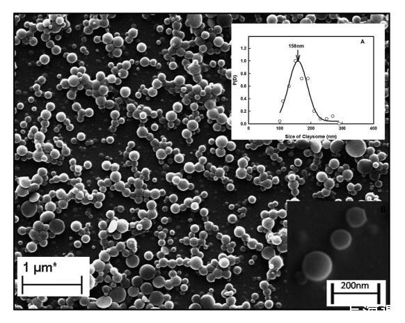 圖1顯示由納米粘土(0.05%)和姜黃素納米顆粒形成的粘土小體組裝體的SEM圖像。插圖(A)顯示了粘粒的高斯粒度分布(從SEM圖像獲得)。發(fā)現(xiàn)大多數(shù)粘土體(核-殼)顆粒的直徑為158±5 nm。插圖(B)顯示了由納米粘土殼和殼厚度為40 nm的姜黃素納米顆粒核形成的單個粘土體。