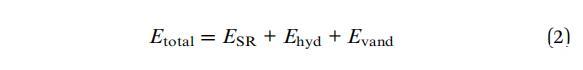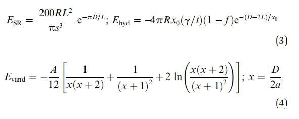 兩種平衡力在組裝的形成中起著重要作用:由兩種粒子之間的界面力控制的疏水相互作用,以及納米粘土團簇和系統(tǒng)疏水環(huán)境之間的空間斥力。因此,復(fù)雜核-殼(粘土小體)組裝的總能量由以下三個貢獻的總和給出:相鄰納米粘土團簇之間的空間斥力(ESR)、9疏水力(Ehyd)、9和范德華力(Evand):34