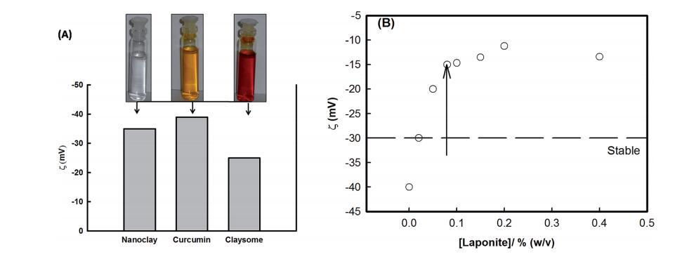圖3(A)描繪姜黃素、納米粘土和粘土小體的zeta電位的直方圖。插圖顯示了姜黃素在乙醇中的分散,納米粘土在水中的分散,以及由納米粘土在無水乙醇環(huán)境中穩(wěn)定的姜黃素納米顆粒組裝而成的粘粒結(jié)構(gòu)(顏色的變化(插圖中所示)清楚地表明了姜黃素和納米粘土之間的相互作用)。(B) 粘土小體組裝的zeta電位隨納米粘土濃度的變化。這清楚地表明了在較低濃度的納米粘土中組裝的穩(wěn)定性。箭頭表示粘土成分。