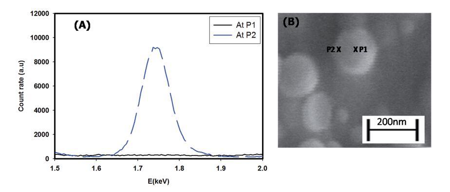 圖1顯示了核殼顆粒組裝的SEM圖像。這清楚地顯示了直徑為158±5 nm的球形顆粒(粒徑的高斯分布在插圖A中給出),具有暗芯和淺電暈(插圖B)。典型的磁芯直徑約為100 nm,電暈寬度約為40 nm。通過光散射實驗確定了組件的直徑。光散射數(shù)據(jù)分析得出的直徑為100–200 nm,最大顆粒數(shù)的直徑為161±10 nm,這與從SEM數(shù)據(jù)獲得的尺寸一致(從DLS獲得的顆粒尺寸的高斯分布在ESI?圖S2中給出)。EDAX結(jié)果證實了粘土片在組件中的位置。圖2(A)和(B)顯示了給定結(jié)構(gòu)在兩個不同位置(xP1和xP2)的能量色散分布。它們清楚地顯示了核心(xP1)內(nèi)不存在硅(粘土結(jié)構(gòu)中的主要元素之一),以及日冕(xP2)中硅的豐度。33,34這證實了粘土片被排除在這些結(jié)構(gòu)的核心之外。因此,可以得出結(jié)論,核心是疏水的,主要含有姜黃素納米顆粒(姜黃素不溶于水),而外殼(電暈)具有自組裝血小板的傾向(LAPONITE®不溶于乙醇)。因此,我們有一個結(jié)構(gòu),其中的核心是一個有機相(乙醇)周圍的水暈。由于其溶解性偏好,姜黃素納米顆粒和LAPONITE®血小板分別優(yōu)先位于有機相和水相。