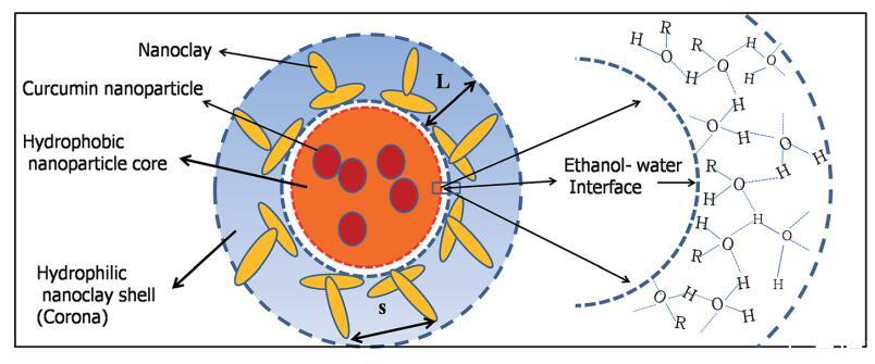 圖4示意圖顯示了在電暈中存在納米粘土團和限制在疏水核內(nèi)的疏水姜黃素納米顆粒的粘土體結(jié)構(gòu)的形成。