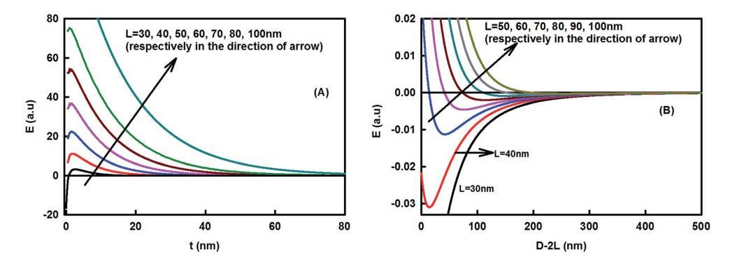 圖5納米粘土簇的長度對粘土小體組裝的影響。(A) 作為界面區(qū)域厚度函數(shù)的能量變化(s?60 nm;T?298 K,f?0.5;姜黃素納米顆粒半徑R?50 nm,疏水衰減長度x0?1 nm,界面張力?40 mN m-1)。(B) 粘粒–粘粒相互作用作為粒間分離D的函數(shù),使用方程(5)計算。當(dāng)存在大的納米粘土團簇時,能量最小值的深度減小,當(dāng)L>80nm時,能量變得完全排斥。