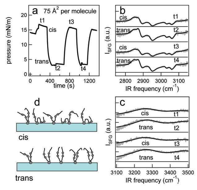 圖6。在脂質/H2O界面處,DT Azo-5P/d75 DPPC的1:5混合物的結果,每個分子的面積為60?2。(a) 表面壓力與時間的關系。用370和450 nm光照射~100秒分別產生順式(高壓)和反式(低壓)狀態。壓力的微小劇烈波動是由于樣品高度的變化,以校正水的蒸發。(b) 相應的VSFG光譜(灰色)以及CD區域的擬合。為了清晰起見,光譜已被抵消。(c) VSFG光譜(灰色)以及用于引導眼睛進入CH區域的擬合。底部曲線顯示了在P時純d75 DPPC的光譜~ 40百萬/米。(d) 脂質尾部方向的示意圖。光開關脂質的偶氮苯部分用灰色圓圈表示。