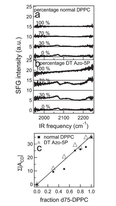 圖9。 (a) 正常DPPC和d75 DPPC不同混合物的CD區VSFG光譜。 圖中給出了混合物中正常DPPC的百分比。 為清晰起見,光譜偏移,細線表示零。 (b) 與a部分類似,但適用于DT Azo-5P與d75 DPPC的混合物。 (c) 通過擬合文中描述的VSFG光譜獲得的CD振動振幅之和,作為含正常DPPC或DT Azo-5P的二元混合物中分數d75 DPPC的函數。 在本實驗中,為了獲得混合物的高質量數據,IR通量很高,導致通過VSFG光譜中相對較高的CH2和CD2振幅觀察到的脂質尾部出現小的無序。