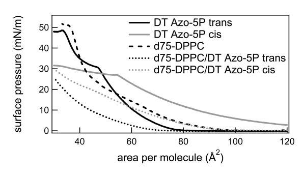 圖2。反式和順式狀態下的光開關脂質DT Azo-5P(實線)、d75-DPPC(虛線)以及光開關兩種狀態下的1:5摩爾比的光開關脂質和d75-DPPC(虛線)的表面壓力與面積等溫線。
