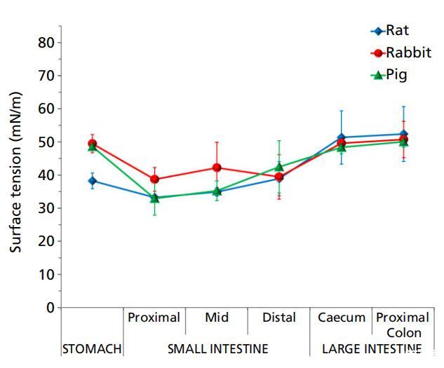 大鼠、兔和豬的胃腸液在整個(gè)腸道的表面張力明顯低于水的表面張力。這些動(dòng)物的表面張力遵循一般模式,胃的表面張力較高,小腸的表面張力較低,而遠(yuǎn)端腸道的表面張力再次升高(圖3,表1)。這種表面張力的行為也與腸道內(nèi)的消化過程相一致。小腸環(huán)境中的消化營(yíng)養(yǎng)物(如葡萄糖、氨基酸、脂肪酸)和消化分泌物(如膽汁)降低了該區(qū)域液體的表面張力,然后在遠(yuǎn)端腸道中重新吸收,從而產(chǎn)生更高的表面張力。