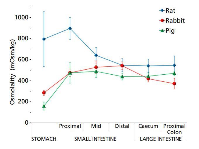 三種動(dòng)物模型的胃腸內(nèi)容物的滲透壓通常遵循相同的趨勢(shì),胃低,近端小腸增加,遠(yuǎn)端減少。豬似乎沿著這種模式一直到盲腸,在結(jié)腸處進(jìn)一步輕微增加(圖2)。然而,在大鼠中,由于胃滲透壓的高度可變性,胃內(nèi)容物的滲透壓與近端和中端小腸的滲透壓沒有統(tǒng)計(jì)學(xué)差異。這種滲透壓模式通常與消化系統(tǒng)的生理學(xué)相一致,在消化系統(tǒng)中,大多數(shù)食物在小腸中被消化并分解為葡萄糖、氨基酸和脂肪酸等組成成分,因此液體的滲透壓較高。隨著營(yíng)養(yǎng)被腸道進(jìn)一步吸收,內(nèi)容物的滲透壓降低。