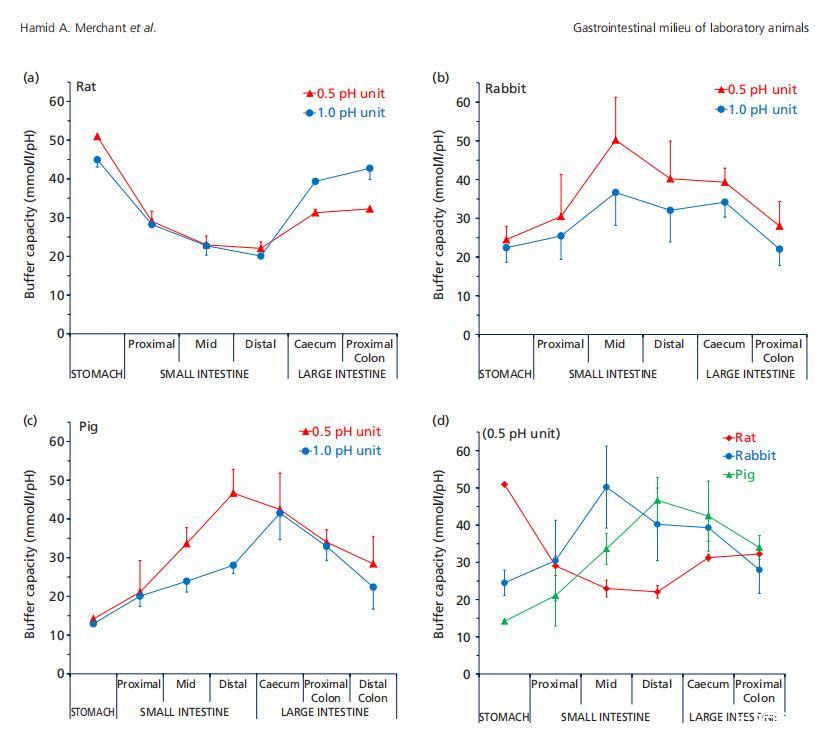 圖1(a)來自大鼠(n=3),(b)兔子(n=6),(c)豬(n=3)的混合樣品的胃腸液(上清液)緩沖容量(平均值±標(biāo)準(zhǔn)偏差(SD)),在pH單位變化0.5和1.0時(shí)測(cè)量,以及(d)整個(gè)胃腸道緩沖容量的種間趨勢(shì)。