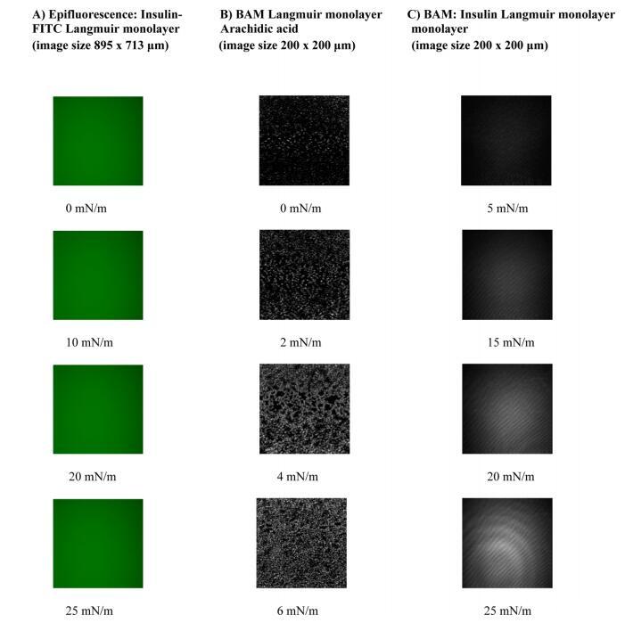 3.4. 人胰島素朗繆爾單層的表觀熒光和布魯斯特角顯微鏡觀察。 人胰島素Langmuir單層的形貌通過FITC人胰島素的表觀熒光進行檢查,而布魯斯特角顯微鏡用于2-D純人胰島素。由于胰島素是非熒光的,因此必須附加熒光團才能使用表觀熒光顯微鏡。 蛋白質常用的探針是異硫氰酸熒光素(FITC)。
