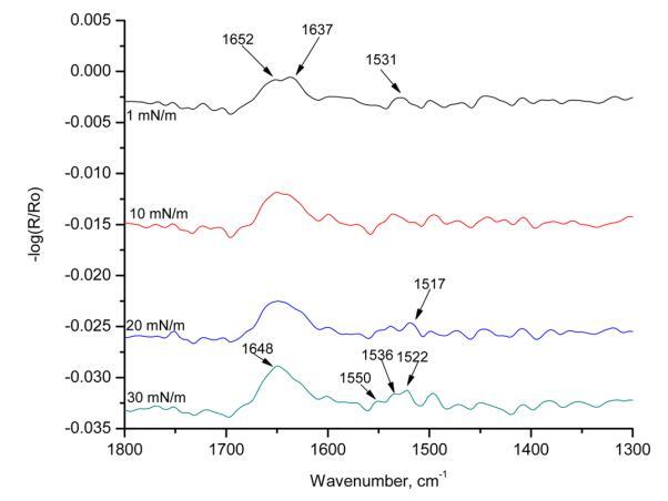 圖7顯示了HI-Langmuir單層在不同表面壓力下60°時的p極化。 這條帶子在1517厘米處 ? 1對應于α-螺旋。 在1 mN/m的表面壓力下,有兩個可見帶:1652和1637 cm ? 1. 隨著表面壓力的增加,這兩個譜帶重疊并成為一個寬帶。 在30百萬米 ? 1,波段可視為單個波段,頻率為1648厘米 ? 1. 這是對應于α-螺旋的酰胺II區域的條帶。 下一個波段在1531厘米處以1 mN/m的寬帶出現 ? 1. 隨著表面壓力的增加,它分成三個帶:1550、1536和1522厘米 ? 1. 在1550和1522厘米處的頻帶 ? 1分別對應于α-螺旋和β-折疊中的酰胺II區域。 這種譜帶分裂表明,譜帶位于1531厘米處 ? 在較低的表面壓力下,1由α-螺旋和β-片組成。 在較高的表面壓力下,譜帶分離為離散的單個峰。 光譜中出現的其他峰是由于氨基酸和烷烴鏈的存在。 這條帶子長1448厘米 ? 1對應于C ? H CH2和CH3的剪切。 HI-Langmuir單分子膜的p-極化輻照度中存在所有三個表明α-螺旋的主譜帶。