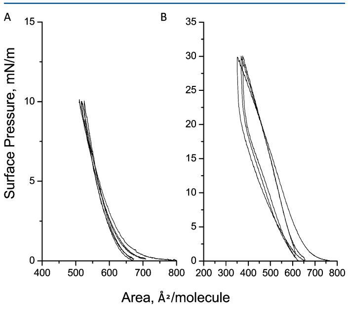 圖2.三個壓縮 ? 在亞相pH值5.6下,減壓循環達到10(a)和30 mN/m(B)的人胰島素Langmuir單層表面壓力。