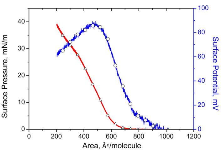 圖1。 表面壓力( △) 表面電位 ? 區域( ○) 亞相pH值5.6時人胰島素Langmuir單層的等溫線。