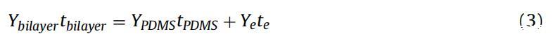 測(cè)量裸PDMS膜的楊氏模量后,將單層電極轉(zhuǎn)移到這些PDMS膜上。使用與裸PDMS膜相同的參數(shù)測(cè)定PDMS+電極雙層的楊氏模量。PDMS+電極雙層由兩個(gè)長(zhǎng)度和寬度相等的粘附層形成,因此使用[33]計(jì)算電極楊氏模量: