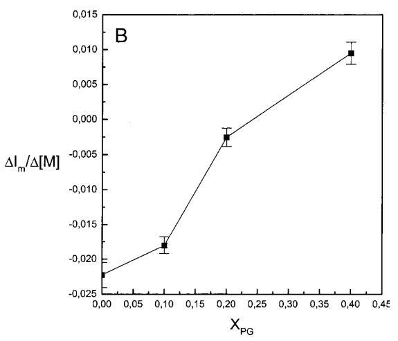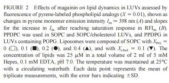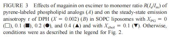 繼上述單層研究之后,有興趣探索肽對脂質動力學的影響。這是通過使用熒光光譜和不同脂質成分的LUV完成的,記錄芘標記的熒光磷脂類似物PPDPC或PPDPG的發射光譜(均為X=0.01)。對于SOPC LUV,添加magainin 2導致芘熒光顯著猝滅,芘單體和準分子發射強度平行降低,如Im所示(圖2)。作為XPG的一項功能,還研究了馬蓋寧2與脂質體結合的后果。當XPG從0.1增加到0.4時,觀察到由于magainin 2在398 nm處逐漸增強的Im(RFIm),而Im的初始增量在明確定義的PG/magainin 2化學計量比~2、3和5時趨于平穩(圖2 A)。在這個初始階段之后,直到給定的化學計量比,還有第二個過程,其斜率也隨著XPG的增加而增加(圖2b)。在XPG=0和0.1時,Magainin 2僅引起Ie/Im的輕微變化,而在XPG=0.2和0.4時,分別減少10%和25%是明顯的(圖3 A)。為了區分脂質動力學中兩種性質不同的變化,即側向遷移率和微結構域形成,作為上述Ie/Im變化的根本原因,我們還通過測量DPH的熒光各向異性r來評估酰基鏈順序的變化(圖3 B)。在缺乏酸性磷脂的情況下,Magainin 2幾乎不會引起r的變化(圖3B)。然而,隨著XPG的增加,加入magainin 2后脂質堆積和酰基鏈順序逐漸增加(圖3b),XPG=0.4時,r最大增加1.4倍。值得注意的是,XPG=0.1時Ie/Im沒有變化以及酰基鏈順序的增加表明PPDPG正在發生微觀富集。有趣的是,在存在膽固醇(Xchol=0.1)的情況下,由于馬蓋寧2的作用,Im和Ie都顯著降低,Ie/Im的變化不顯著(圖2A和3A)。如前所述(van Ginkel et al.,1989),添加肽前r的增加(圖3 B)揭示了通過在膜中摻入膽固醇而增強的膜順序。然而,在膽固醇存在的情況下,magainin 2對r沒有進一步的影響(Xchol=0.1,圖3b)。