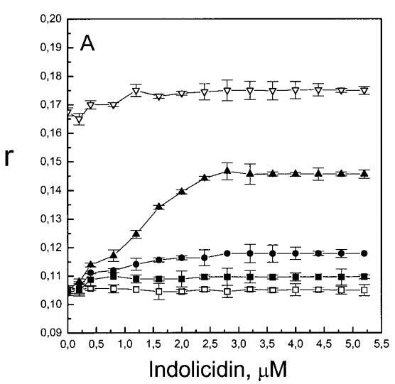 與magainin 2類似,吲哚青霉素與陰離子和兩性離子囊泡的膜結合非常不同(圖1b、4和5),與先前的平衡透析研究一致(Ladokhin et al.,1997)。雖然芘熒光的猝滅顯示吲哚肽被分配到SOPC雙層中,但對膜酰基鏈順序幾乎沒有影響(圖5)。相反,吲哚西啶與陰離子膜的相互作用導致脂酰鏈順序增加,明顯表現為DPH熒光各向異性增加,并對XPG呈S形依賴(圖5)。與magainin 2相反,吲哚西丁導致芘單體和準分子發射強度顯著平行降低,與脂質成分無關,Ie/Im變化較小(圖4)。相應地,吲哚西丁誘導酸性PG富集到微區。有趣的是,在吲哚西丁/脂質摩爾比為1:20以下,芘Im的減少順序為XPG=0.40.20.10(圖4a),而在吲哚西丁/脂質摩爾比為1:10時,Im的減少對XPG的依賴性相反。這種變化的可能機制如下。在低肽/脂摩爾比時,吲哚西丁似乎被調節到雙層界面(Ladokhin等人,1997),芘標記鏈的鏈反轉(Holopainen等人,1999)使該部分更接近雙層表面,從而允許其與吲哚西丁的基本殘基接觸。后者通過π-陽離子相互作用導致芘部分的碰撞猝滅。然而,隨著XPG的增加,我們可以預期PG頭基與吲哚西丁的堿性殘基發生靜電結合,從而阻止芘與吲哚西丁的陽離子殘基之間的直接接觸。隨著肽濃度的增加,吲哚肽的膜結合以協同方式增強,猝滅效率的逆轉可能涉及雙分子層中脂肽復合物的聚集。因此,在酸性含磷脂的膜中,吲哚對芘的猝滅作用較小。當吲哚肽的濃度增加到肽/脂比1:10以上時,肽將以高度協同的方式并入膜的酰基鏈區域(Ha等人,2000)(圖9 E),而在中性膜中,肽位于界面(圖9 D)。插入吲哚西丁的量取決于雙層中的XPG,導致吲哚西丁的Trp殘基的猝滅占主導地位,與XPG=0.4時Im的顯著減少一致(圖4a)。