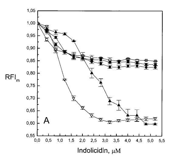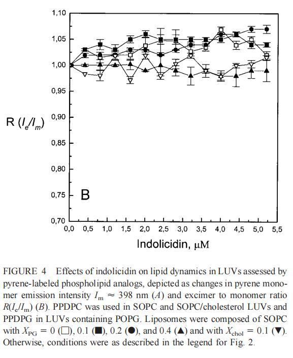 這兩種抗菌肽對芘標記的磷脂類似物的猝滅機制令人感興趣。可能涉及π-陽離子相互作用(Dougherty,1996),后者由肽的堿性殘基表示。吲哚西丁具有較高的Trp含量(39%),可促進其分配到脂質雙層(Wimley和White,1996)。因此,芘和色氨酸之間的π-相互作用也是可能的。已經證明,色氨酸可以淬滅膠束溶液中各種芘衍生物的熒光發射(Encinas和Lissi,1986;Altamirano等人,1998)。另一種可能性是鏈反轉(Holopainen et al.,1999),通過肽與脂質雙層結合,導致芘部分調節到更極性的環境中,從而增加熒光團微環境的極性,并導致量子產率降低。