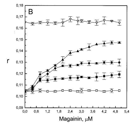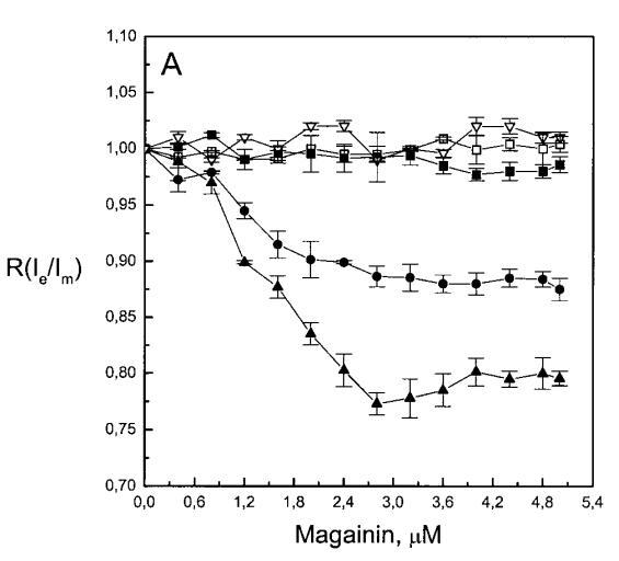 有趣的是,在存在酸性磷脂的情況下,肌動蛋白/脂質的摩爾比(在該摩爾比下,肌動蛋白的初始增量趨于穩定)分別為1:21、1:16和1:12.5,對應于XPG=0.1、0.2和0.4(圖2A),分別產生1:2、1:3和1:5的肌動蛋白/磷脂化學計量比。同時,DPH的初始r增量在magainin/脂質摩爾比為~1:30、1:12和1:5時趨于平穩(XPG分別為0.1、0.2和0.4),對應于大約1:3、1:2.5和1:2的magainin/PG化學計量比(圖3)。據報道,在這些肽/脂質摩爾比下,magainin可插入含酸性磷脂的膜中(Ludtke等人,1994年)。此外,已經證明,雙分子層中magainin的=-螺旋的方向取決于肽與脂質的摩爾比,在上述化學計量比下,螺旋應垂直于膜表面插入,在含PG的膜中形成孔(Ludtke等人,1996)。這些孔不僅由兩親螺旋的極性面組成,而且還由脂質的極性頭基組成,內外單層通過這些孔襯脂質是連續的。膜中的這種結構可能會降低探針芘部分微環境的極性,從而提高其量子產率。有趣的是,當XPG>0.1時,magainin 2逐漸降低Ie/Im值(圖3 A),這與增強的酰基鏈順序減少脂質側向擴散的速率一致。然而,由于magainin 2已經在XPG=0.1時增加了r,Ie/Im沒有變化,我們可以得出結論,PPDPG探針向微區富集以及其橫向擴散的減少正在發生。